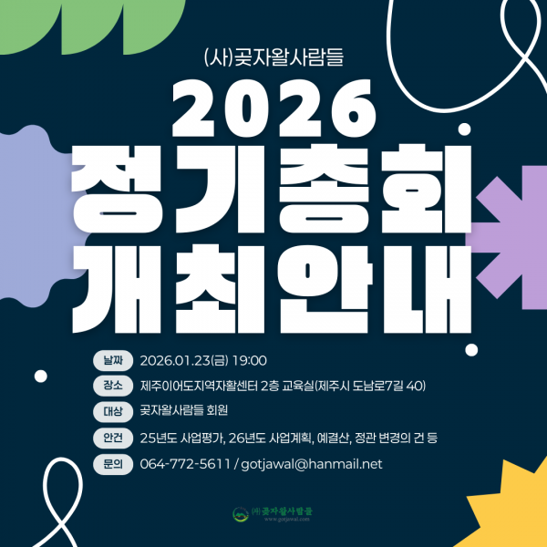 (사)곶자왈사람들의 정관 제20조(총회 구성 및 소집)의 규정에 따라 2026 정기총회를 다음과 같이 진행합니다.