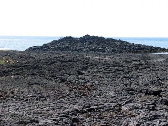 [제주시 한경면 용당리 해안에서 촬영, 앞쪽에 새끼줄구조가 잘 나타나 있으며 뒤쪽에 튜물러스가 위치하고 있다. 새끼줄구조로 용암류가 이동한 방향을 확인한 결과 바닷가 쪽으로 이동하였음]