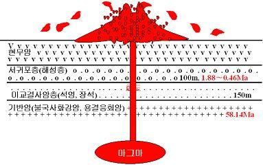 마제형(馬蹄型) 궤물오름은 어떻게 만들어 졌을까? : 지하 깊은 곳에 있던 마그마가 분출하여 북제주군 애월읍 장전리 산 136-1번지 일대에 궤물오름(표고 : 597.2m 비고 : 57m)이 만들어지게 되었다.